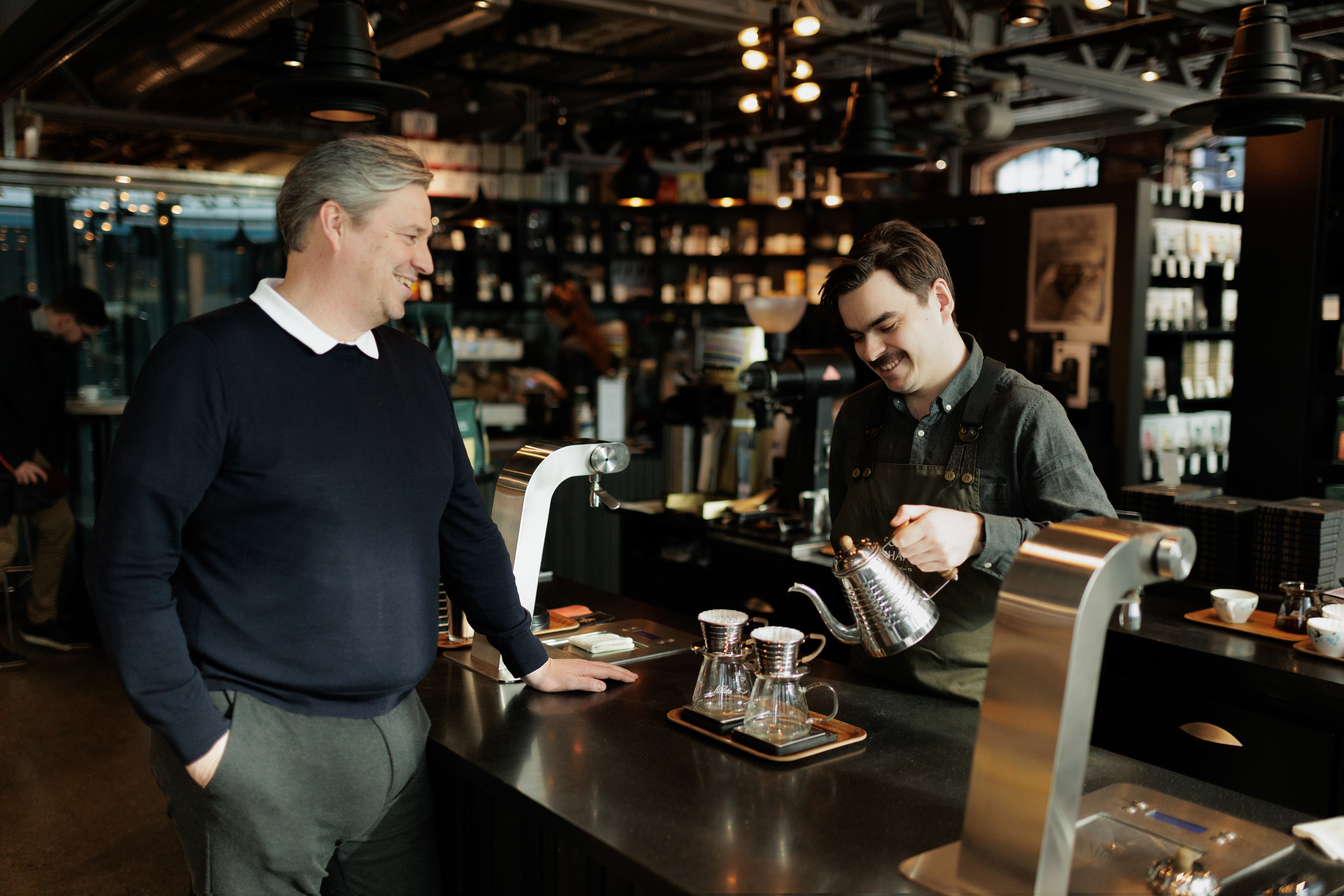 Frode Rønne Malmo, daglig leder av Mathallen og konseptsjef bygulv for Aspelin Ramm med Arne Hanserud, daglig leder av Solberg & Hansens konseptbutikk på Mathallen Oslo.
