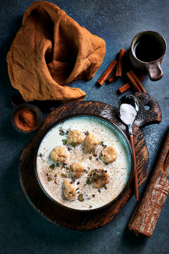 Bland hvetemel, egg, sukker, salt og melk til en fast deig. Kok opp melk og sukker. La melken holde seg rett under kokepunktet. Form små boller, legg dem i melken og la trekke i 10 minutter. Server med litt sukker og kanel på toppen.