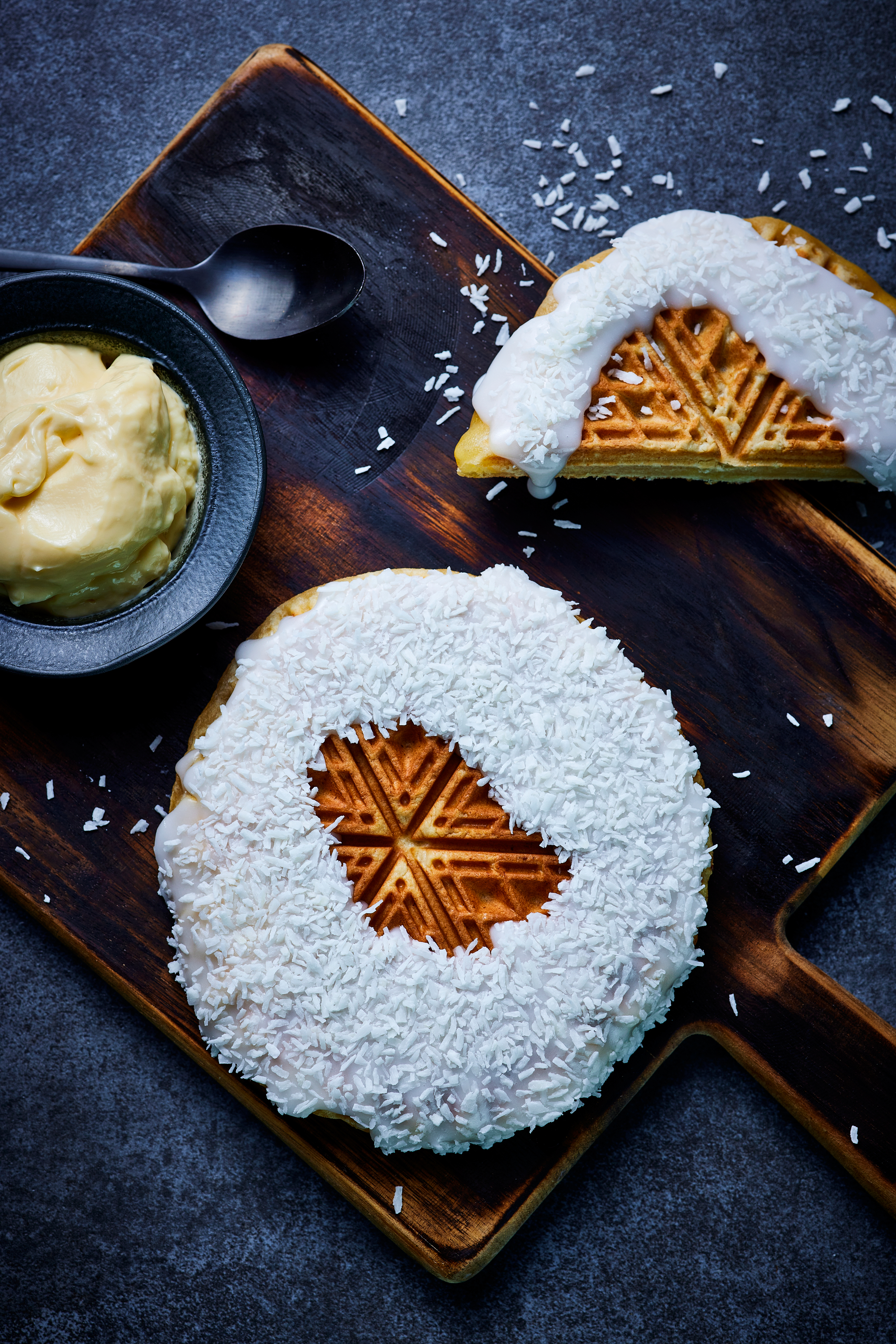 Skolebrød og vaffel er to ting de aller fleste har et nostalgisk forhold til, og nå har vi slått disse sammen! Kombinasjonen av myk bolle, god stekeskorpe, vaniljekrem, melis og kokos er rett og slett fantastisk.