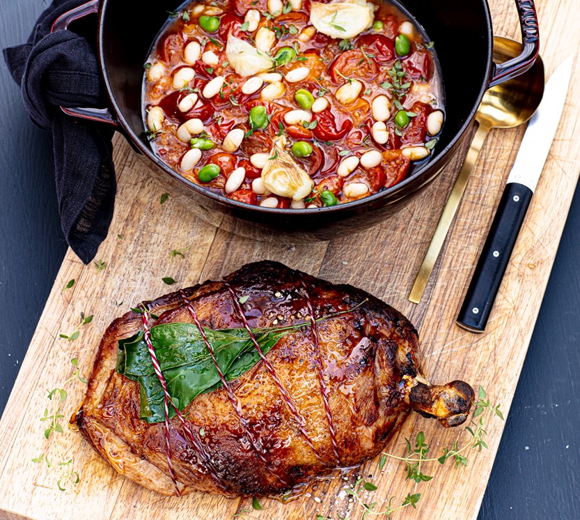 La den hvile på benken. Del tomater, finhakk sjalottløk og paprika. Stek dem sammen med 2 dl olivenolje, salt og pepper til tomatene har sluppet væske og er kokt sammen med oljen. Tilsett lammekraft, hvite bønner og hvitvin og et par hvitløksfedd.