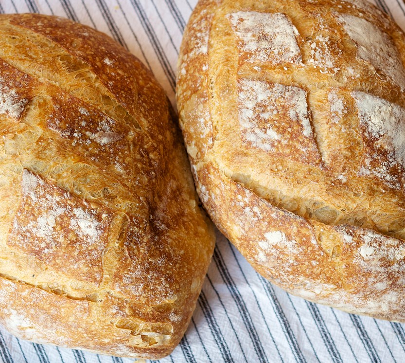 La disse hvile i en halvtime. Slå dem opp til brød som legges i en smurt langpanne eller en plate med bakepapir. Hev dem til dobbel størrelse og snitt dem med skråstilte snitt.