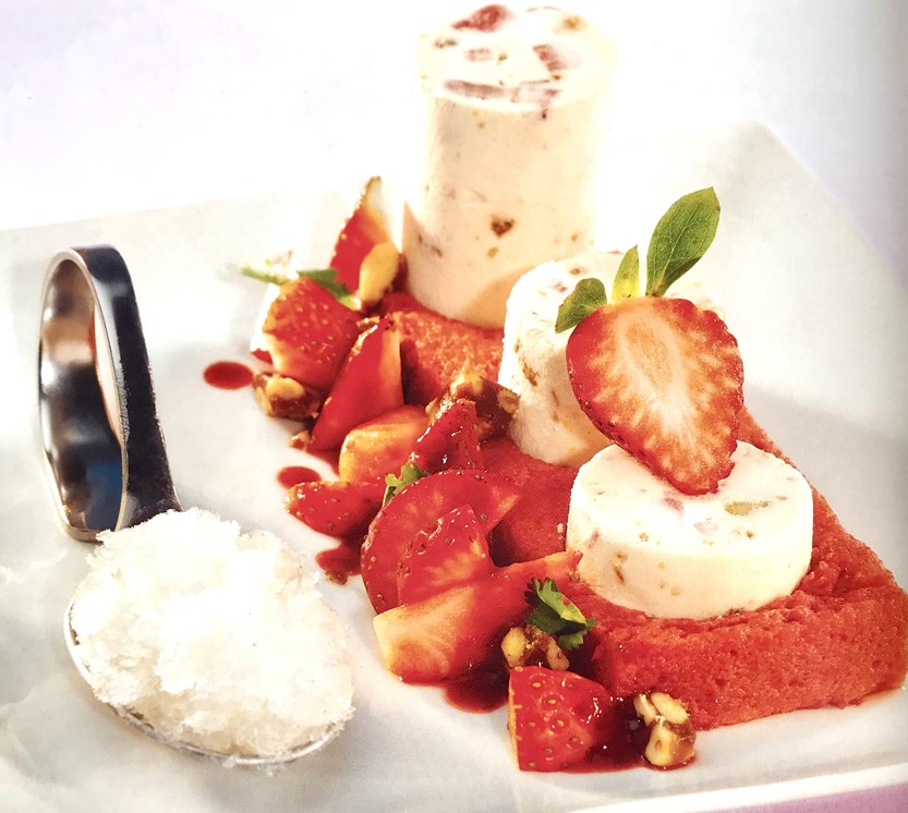 Kok vann og sukker til 121 °C. Spe over piskede eggeplommer og pisk det kaldt. Pisk fløten til krem. Bland dette sammen med de piskede eggeplommene. Vend inn ønsket mengde krokan og hakkede jordbær.