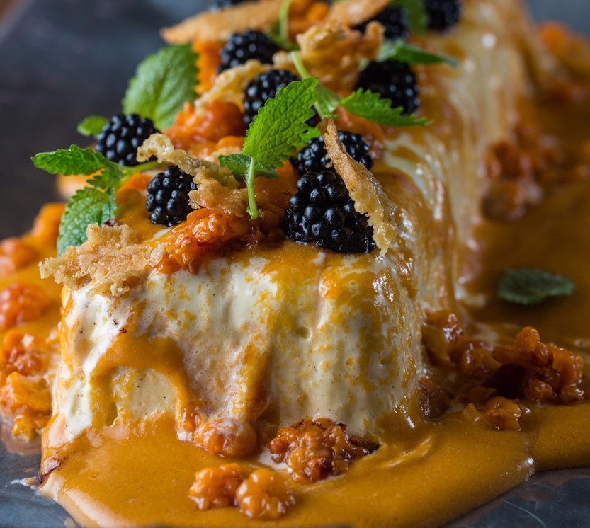 minutter før de skal spises. Isparfaiten anrettes med multesaus, litt friske multer og bjørnebær. Sprø havreflarn gir litt krønsj til desserten.