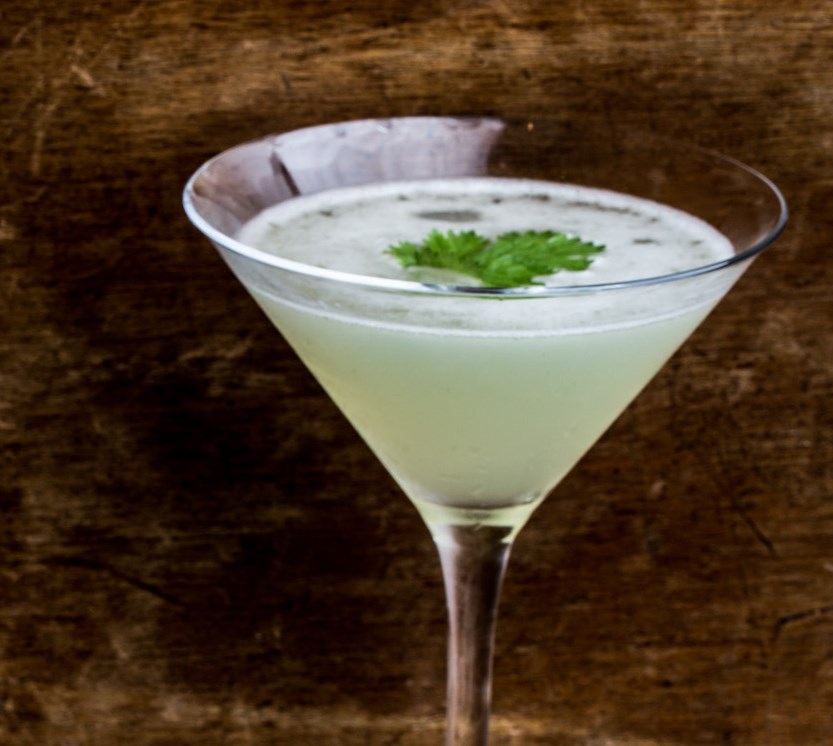 Ristes godt og finsiles i et cocktailglass.