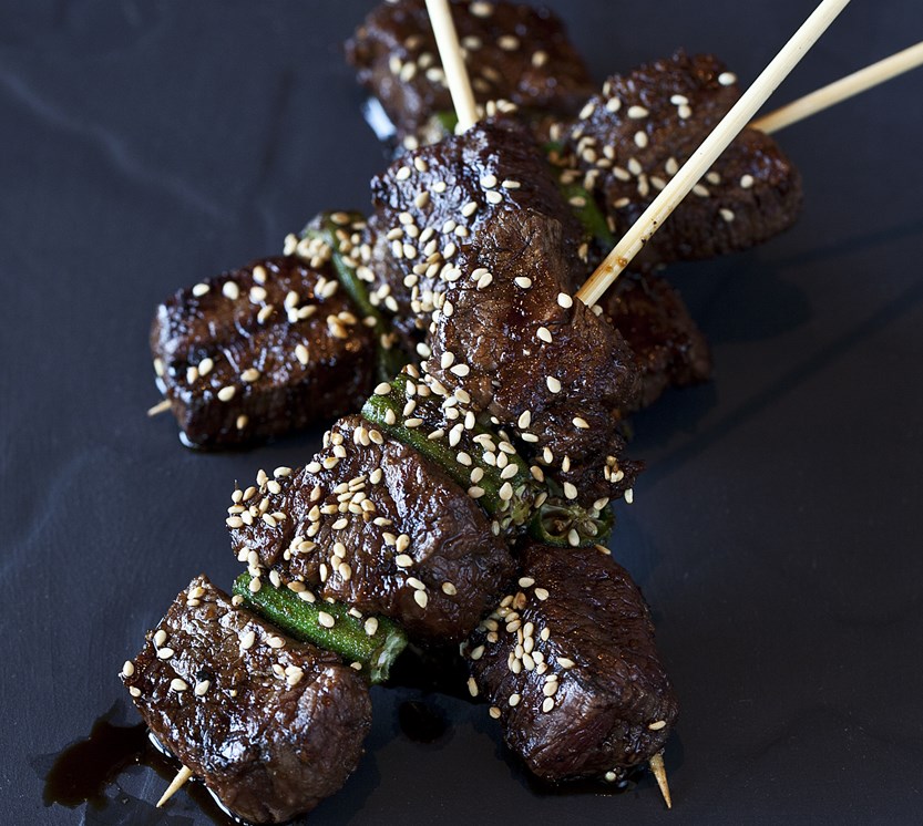Bland sukkeret med soyasausen over svak varme til sukkeret er smeltet. Ta kjelen av varmen og avkjøl. Tilsett resten av ingrediensene og avkjøl marinaden. Det beste er å lage den dagen før. Den skal være tykk, sterk og søt. Skjær kjøttet i ca 4 cm lange biter og tre kjøttet og okrabitene på et trespyd som har ligget og trukket i vann. Krydre med salt og pepper.