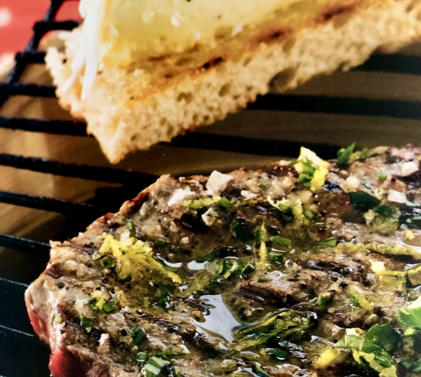 Det piskede hvitløksmøret legges oppå det grillede brødet.