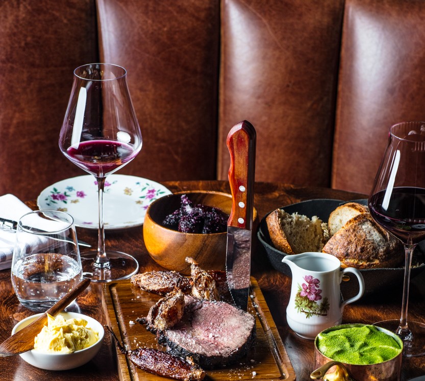 Skjær opp den braiserte høyryggen, pensle med røkt olje og salt. Legg den på en trefjøl sammen fritert sjalottløk. Fyll estragonsausen i en liten kasserolle og dryss på med urtepulver. Server med maltsaus og syltet rødbeter.