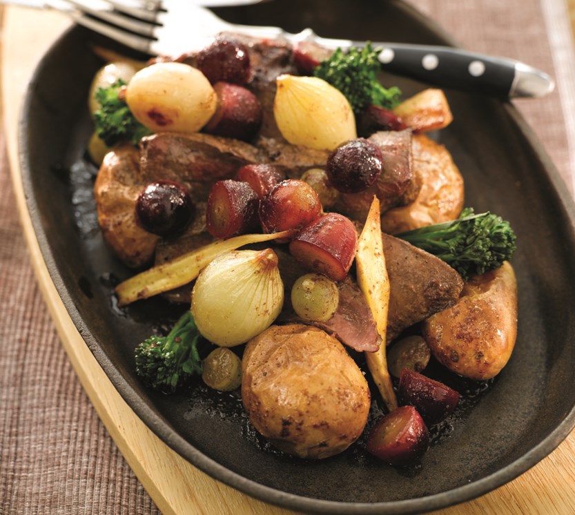 Hell det lett brunede smøret fra grønnsakene i det lett brunede smøret fra leveren og tilsett madeira og druer. Dette skal småputre i 2 minutter før du smaker til med salt, pepper og litt sukker. Anrett så poteter, grønnsaker og lever på tallerken og hell madeira og druesausen over. Dette er en enkel, men svært forfriskende kontrast til lever i fløtesaus.
