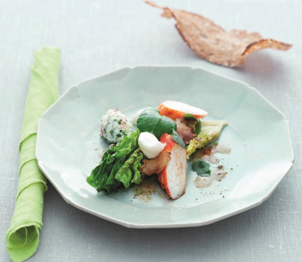 Du finner oppskrift på kongekrabbe, hjertesalat og frisk sellerikrem >