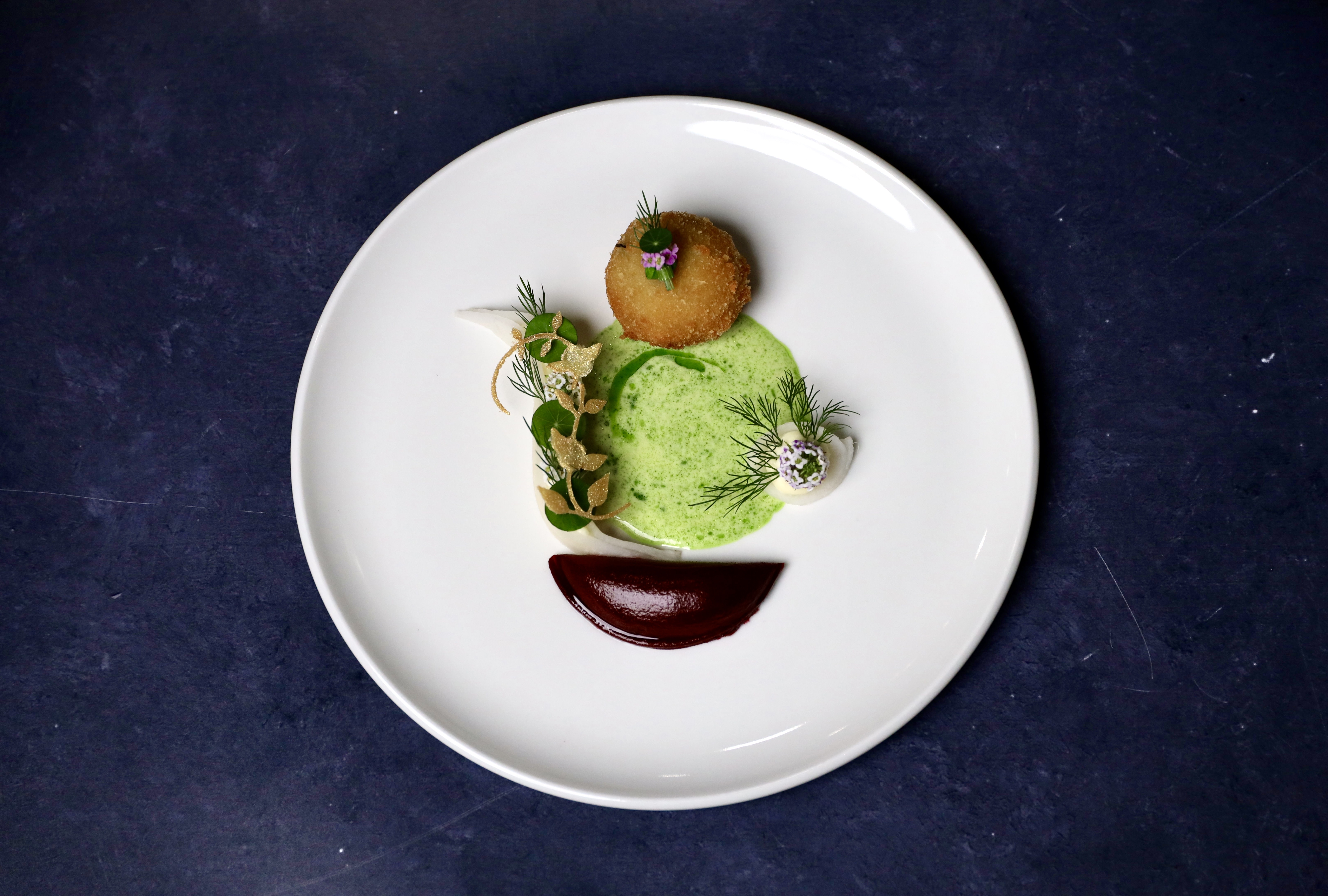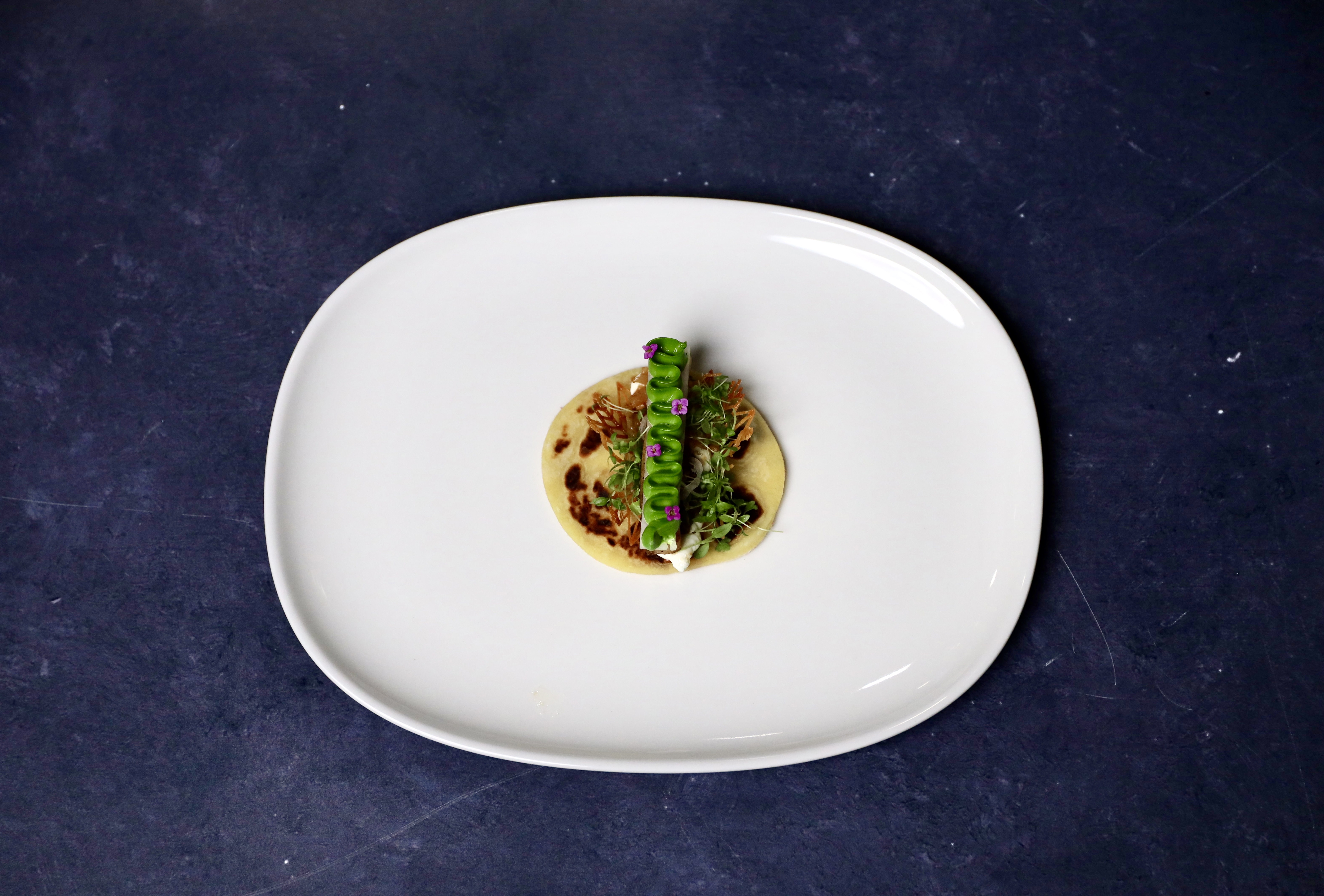 Forrett: Potetlefse, bakt persillerot, purreløkmajones, bakt løk med heggeblomseddik, sprø løk og potet, romme tilsmakt norsk grønn chili og sjalottløk