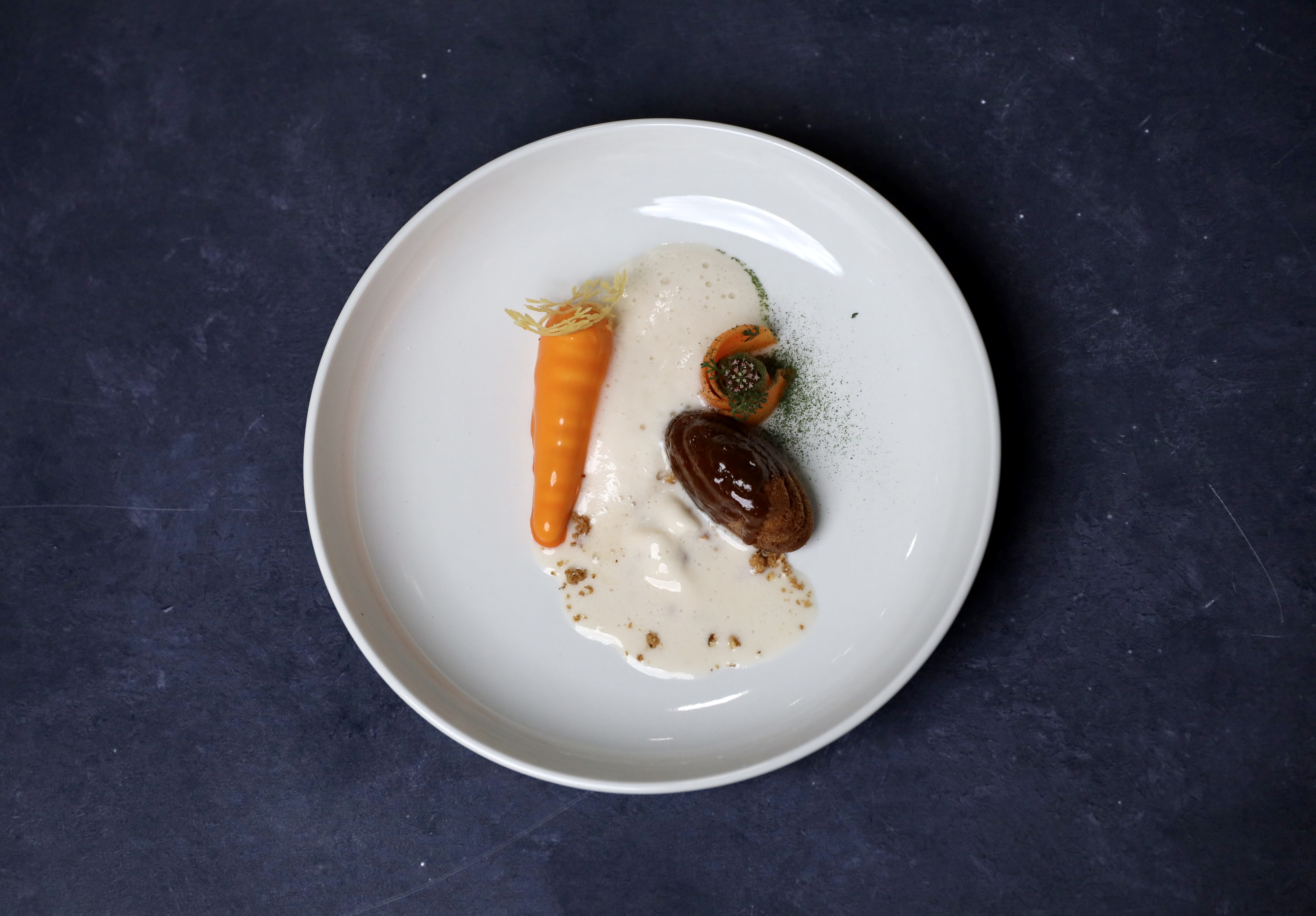Dessert: Glasert hvit sjokolade mousse, eplekompott, epleskum, "salat" på eple, kjørvel, tagetes og gulrot, gulrotkake, karamellisert hvit sjokolade, eple og yoghurtsorbet og kjeks laget på dems egen honning