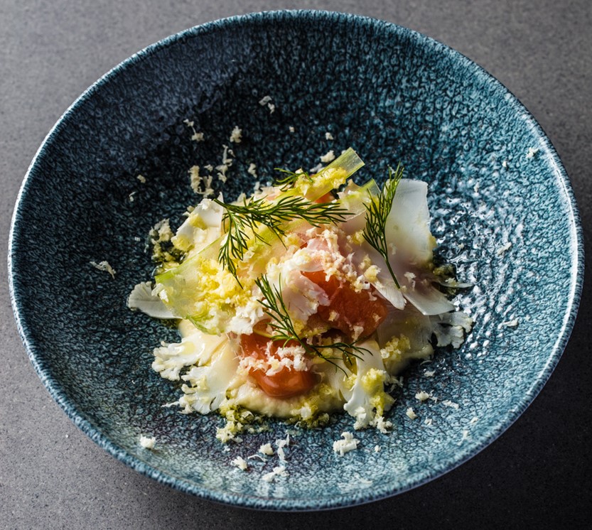 Skives tynt på en mandolin og legges i isvann et par timer før servering. Når du legger opp retten starter du med blomkålpuré og legger alt lagvis i en vid skål. Avslutt med reven pepperrot, dill og god olivenolje.