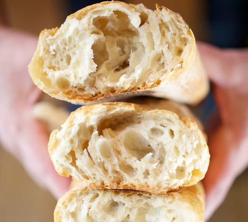 Form dem til avlange baguetter på ca 40 cm og legg dem på en plate med bakepapir. Skjær 4-5 sylskarpe snitt i hver med et barberblad.