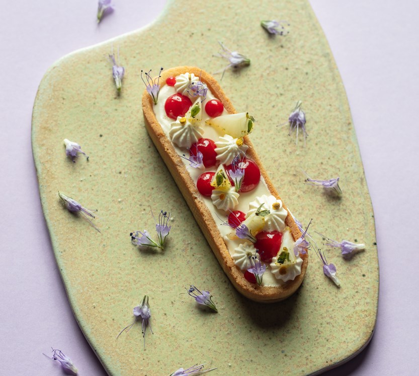 Kok opp jordbærpuré med sukker, sitron og agar. La det koke i 1 minutt, trekk av platen og sil av før det settes i kjøleskapet. Når blandingen er satt, kjør opp på kjøkkenmaskin. Pynt terten med jordbærgelé og den pynten du liker.
