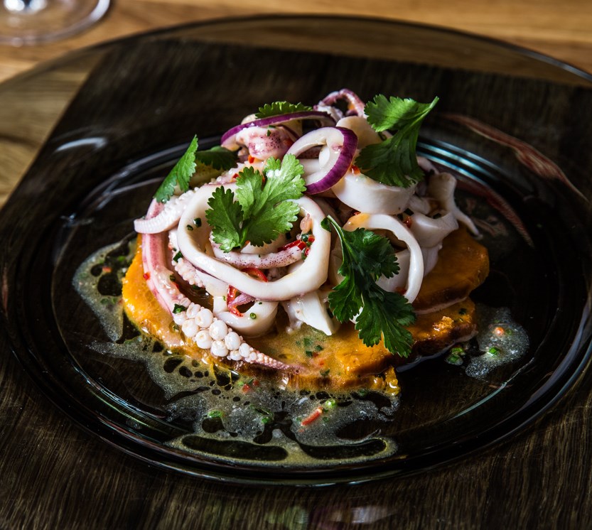 Anrett søtpotet i taksteinmønster på tallerken og legg over et lag med avocadokrem. Anrett akkar og lime-salaten på toppen,