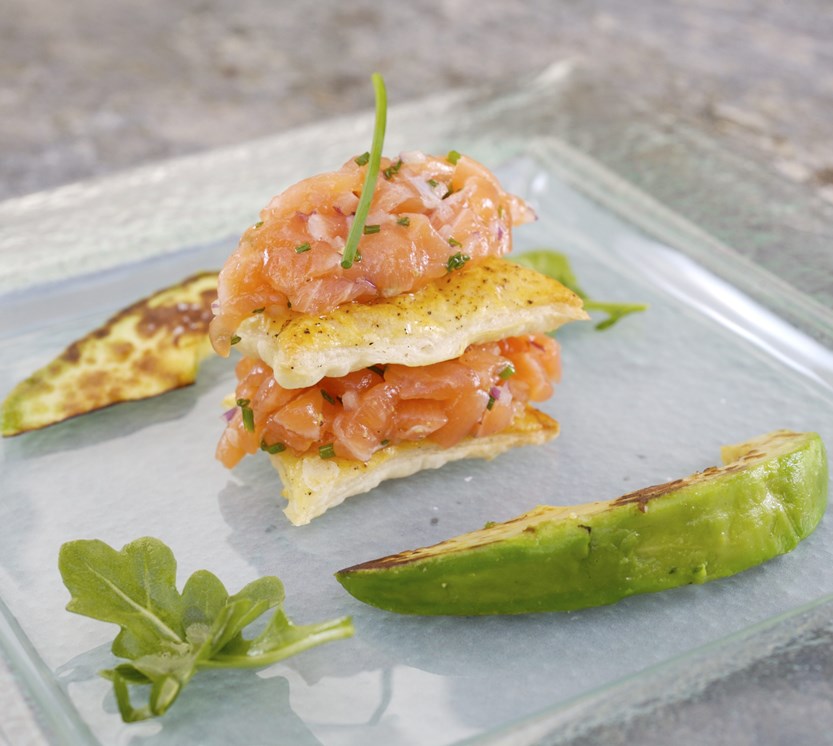Anrett laksetartaren i en sandwich med butterdeig og legg avocadobitene rundt. Pynt med gressløk og urter.