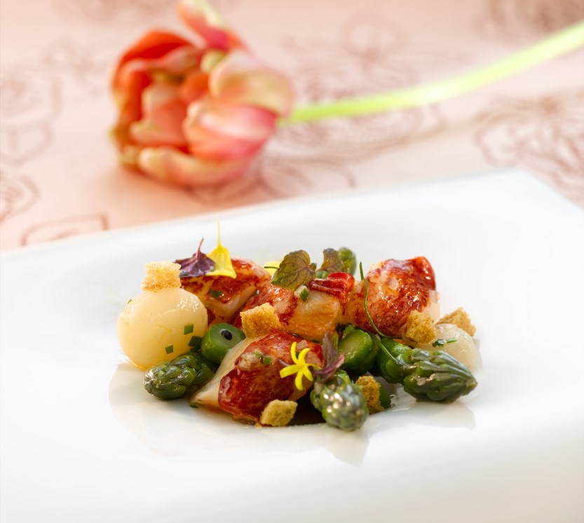Skrell jordskokken og aspargesen. Kutt jordskokken i terninger eller skiver, og stek dem i olje til de er møre. Aspargesen kokes i lettsaltet vann og avkjøles i isvann. Finkutt sjalottløk og del hummerhalene i mindre skiver. Stek dem raskt i varm panne med salt og pepper. Ta pannen av varmen og tilsett sjalottløk, god olivenolje og smak til med salt, pepper og sitronsaft. Serveres umiddelbart med jordskokk og asparges.