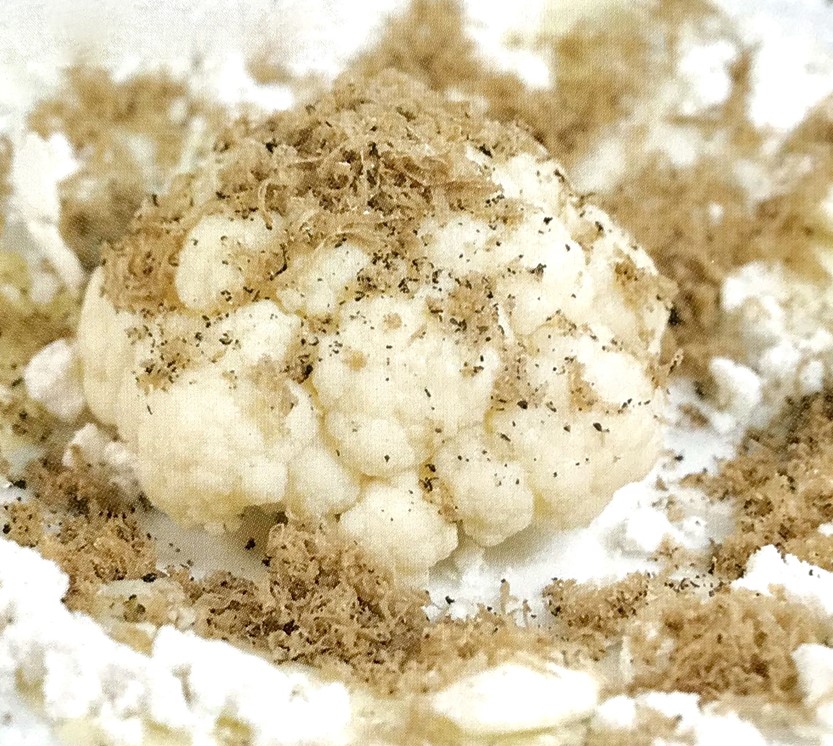 Legg fire små blomkål i en form og stek dem i ovnen i ca 10 minutter. Avkjøl dem hurtig i isvann. Ved anretning skal de lunes i saltet beurre monte. Det siste blomkålhodet rives på en mandolin i tynne små flak og marineres i sitronsaft, mandelolje og salt.