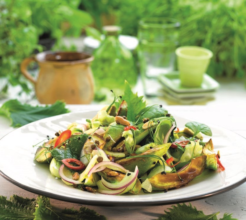 La det avkjøle litt og vend inn resten av ingrediensene. Smak til med salt, pepper og eventuelt mer syre. Denne salaten kan spises alene eller som garnityr til grillet fisk og hvitt kjøtt.