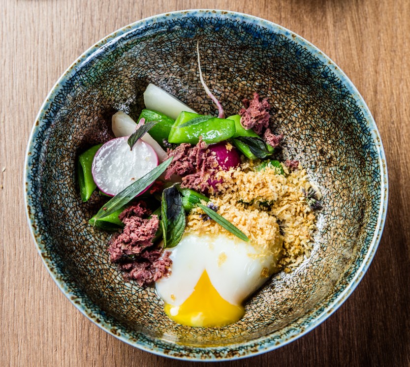 Posjer eggene på 63 °C i ca. 45 minutter. Kok sesongens grønnsaker i litt vann og salt, rør inn smør og smak til med sitron. Det skal være syrlig. Stek pankomelet i en panne til det er gyldent med litt salt og smør. Knekk egget i en skål og legg i grønnsaker. Ha på pankomel og riv røkt reinsdyrhjerte over. Legg på urter.
