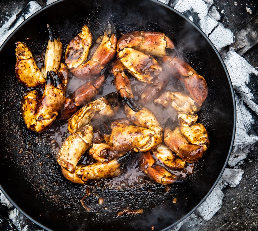 Stek sjalottløk med olje i en glovarm wok-panne på grillen, men pass på slik at du ikke svir den. Tilsett krabbeklørne og wok dette sammen. Tilsett sausen og gi alt ett oppkok til det tykner.