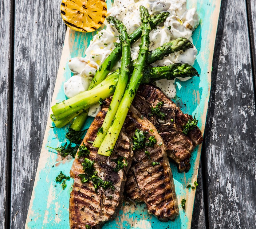 Kutt av nederste 2 cm av aspargesen og skrell den nederste delen. Kok dem møre i kokende vann med rikelig med salt. Mariner med olivenolje og persille før servering.