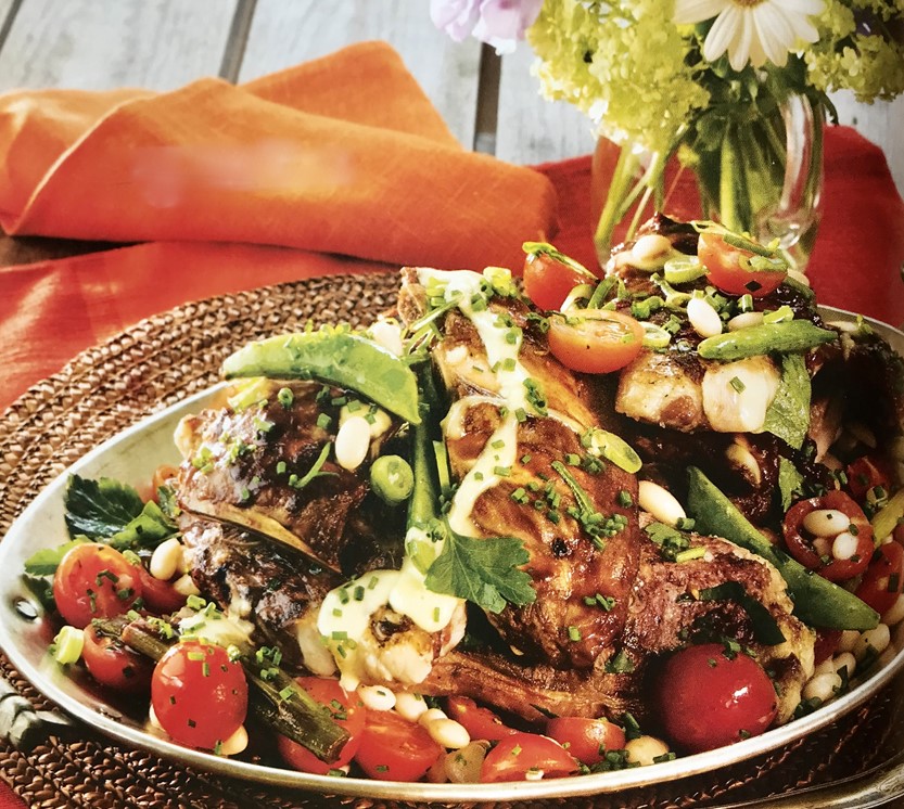 Pensle spareribsen med blandingen flere ganger mens de ligger på grillen. Legg tomat- og bønnesalaten på et fat og legg kjøttet oppå.