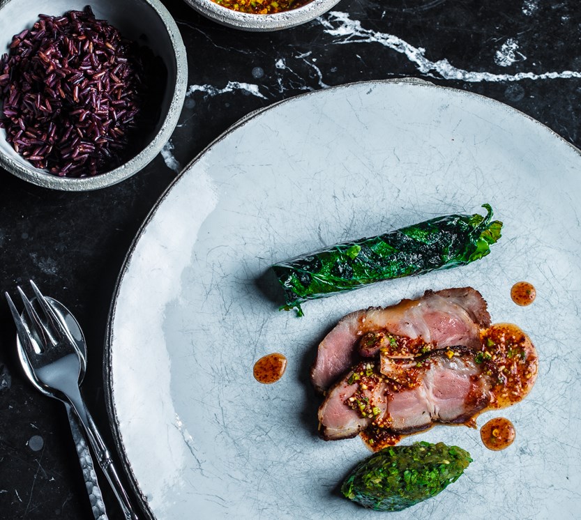 Den ultimate gatematopplevelsen er lukten av grillet svinekjøtt, en sterk saus og litt sticky rice. Vi lager en fest av dette ved bruke svinenakke fra Heinrich Jung. Vi marinerer det i chili, hvitløk og sitrongress, og griller det på kullgrill. Så glaseres kjøttet med maltose. Vi serverer den klassisk med sterk chilisaus basert på chilipulver, fiskesaus, soya og lime. En relish fra Lahu-stammen i Nord-Thailand, som består av bakt ingefær, hvitløk, sjalottløk og chili blandet med frisk koriander.