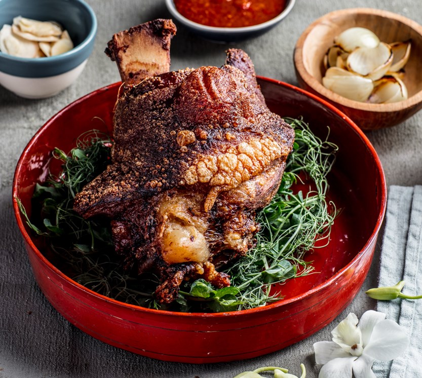 Braisser svineskanken i ovnen på 85 °C i 12-15 timer.