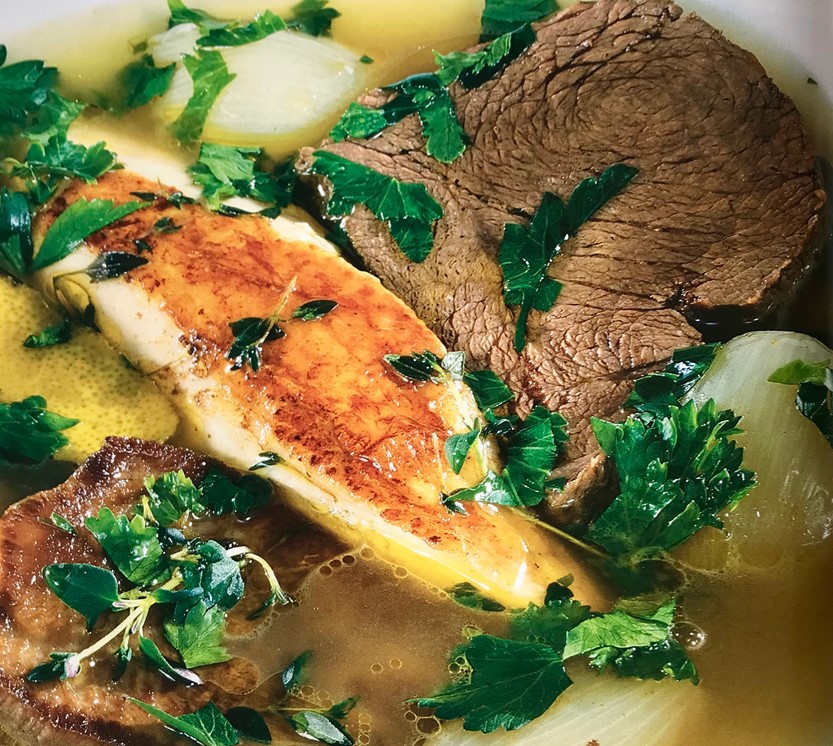 Kutt opp selleri og gulrot. Hakk persille og snitt sitronskallet i strimler. Når kraften har kokt opp, lar du kjøttskivene og grønnsakene trekke seg varme. Brun bryststykkene av høna og skivene av tunge i litt smør. Fordel alt i dype tallerkener og dryss over med persille og sitronskall eller ha alt opp i en stor terrine.