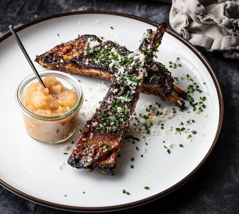 Medister og innmatpølse, rødkål, svisker og stekte epler.